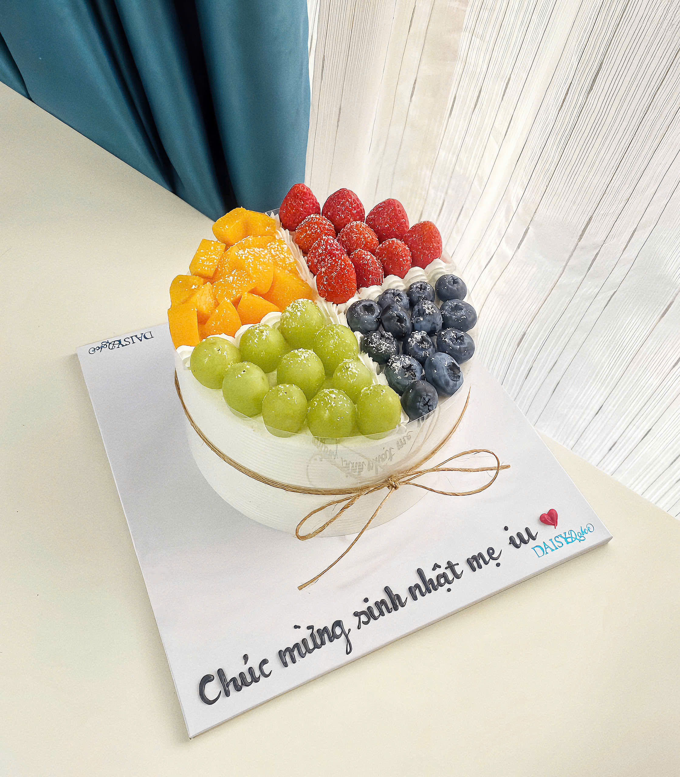 Mô Tả Nhân Bánh : 3 lớp bông lan, 2 lớp mứt và trái cây tươi khách sẽ được chọn 1 trong các loại trái cây hiện DAISY đang có.