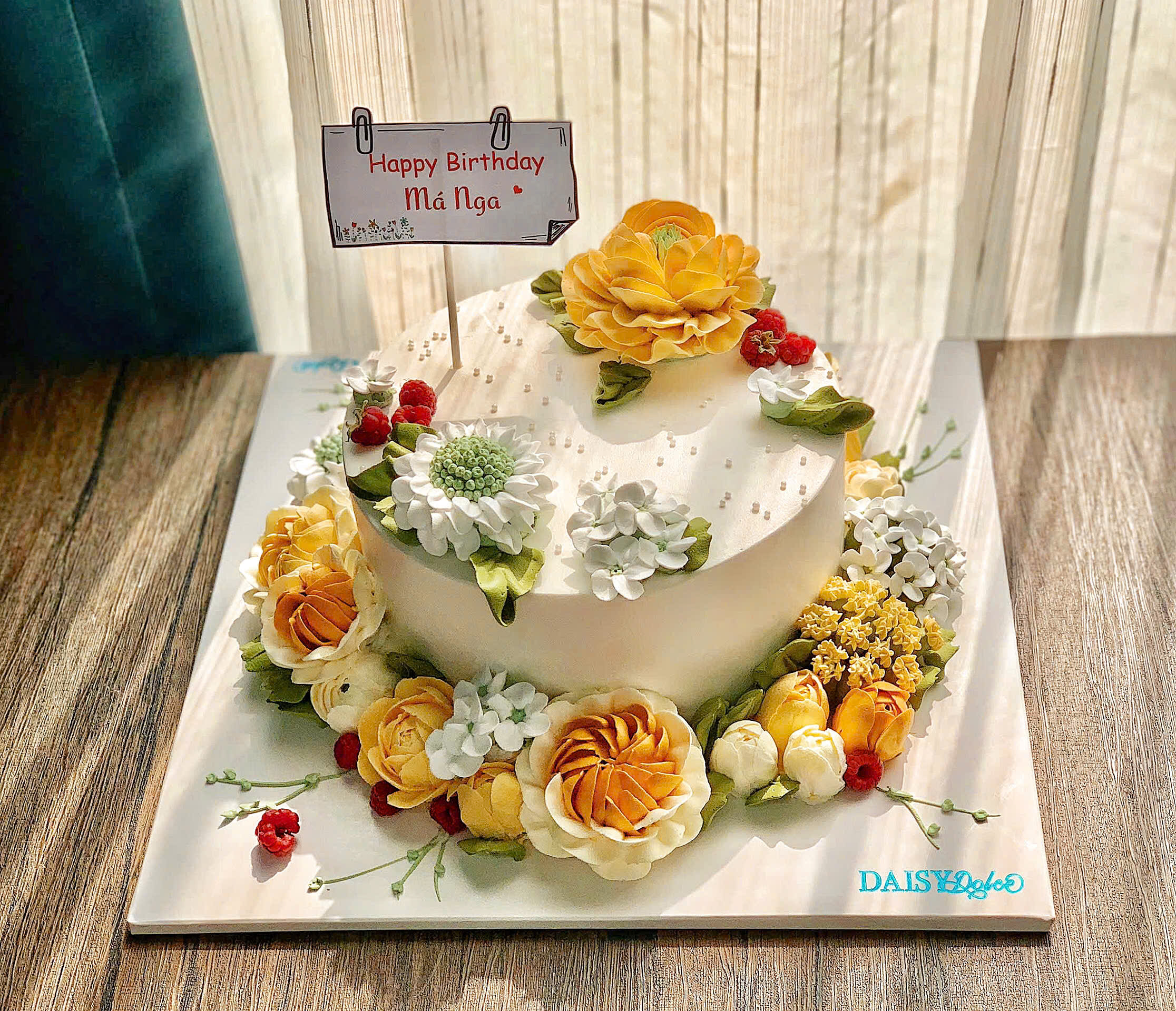 Mô Tả Nhân Bánh : 3 lớp bông lan, 2 lớp mứt và trái cây tươi khách sẽ được chọn 1 trong các loại trái cây hiện DAISY đang có.