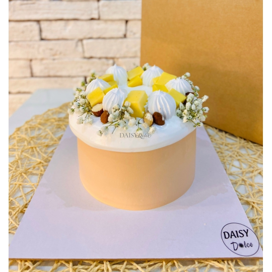 Mô  Tả  Nhân  Bánh : 3 lớp bông lan, 2 lớp mứt và trái cây tươi khách sẽ được chọn 1 trong  các  loại trái cây  hiện  DAISY đang có.